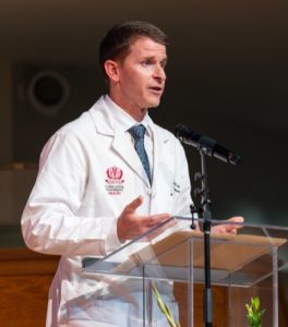 Before the students received their white coats, Justin Dye ’07, assistant professor of neurosurgery (pictured left),welcomed the incoming class and shared practical advice for succeeding in medical school. He emphasized the importance of building strong study habits, getting regular exercise and sleep, and taking time to connect with classmates and build friendships.