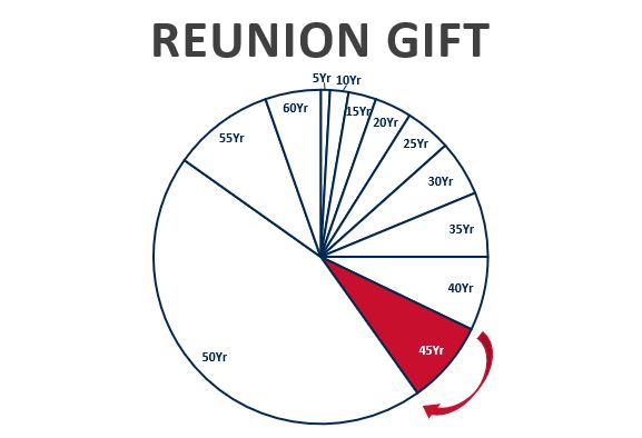 The time frame for a Reunion Gift is the 5-year period between milestone reunions. Because Reunion is at the end of June, the “year” we count here is July 1 to June 30, for simplicity sake. So, for example, if a class celebrates their 40th Reunion in June of 2022, then their next Reunion Gift is the total tally from July 1, 2022, to June 30, 2027, and funds raised in that time period will be referred to as their “45th Reunion Gift.”