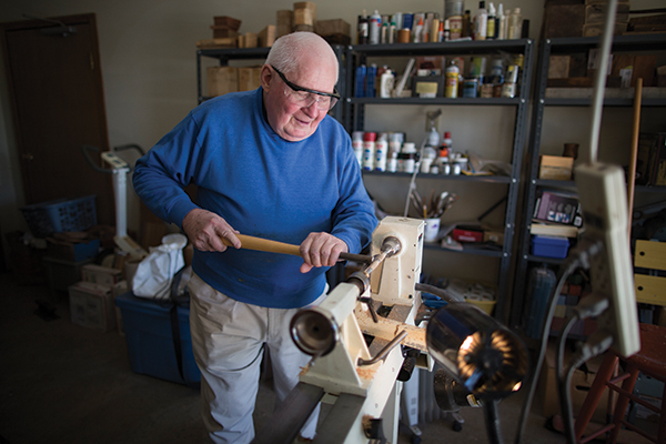 Classical music from a dusty Bose stereo usually accompanies John Buckner as he turns wood in his garage.