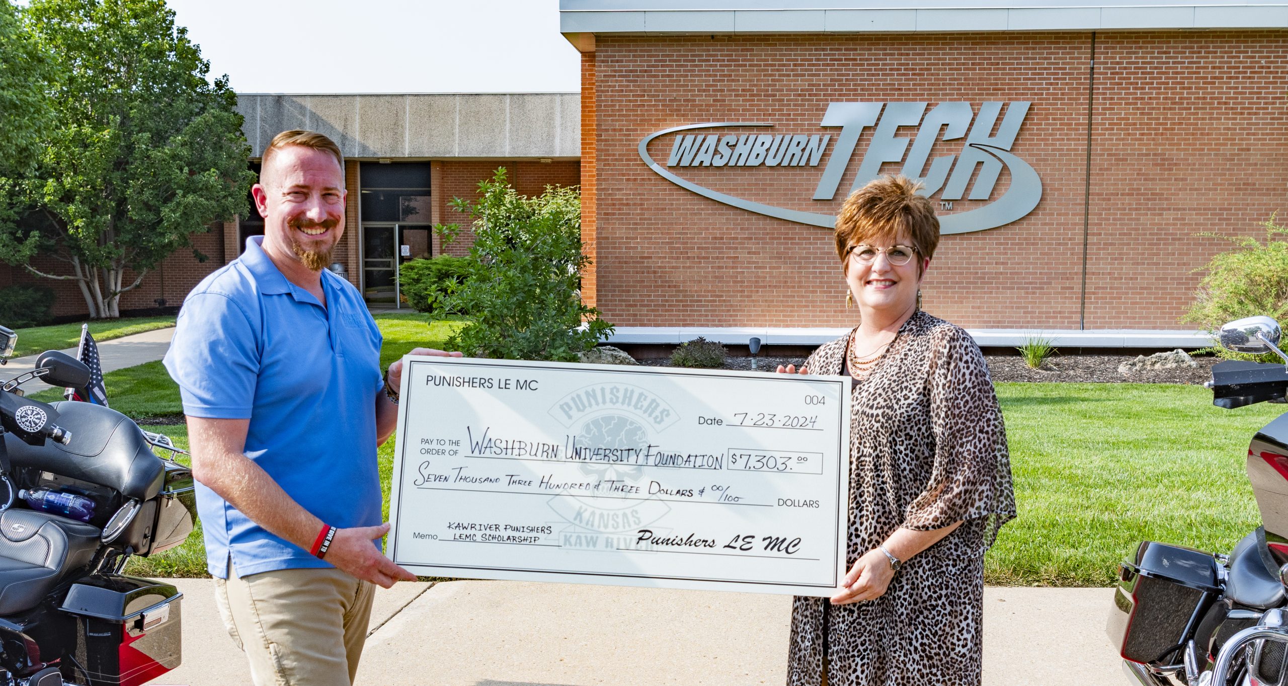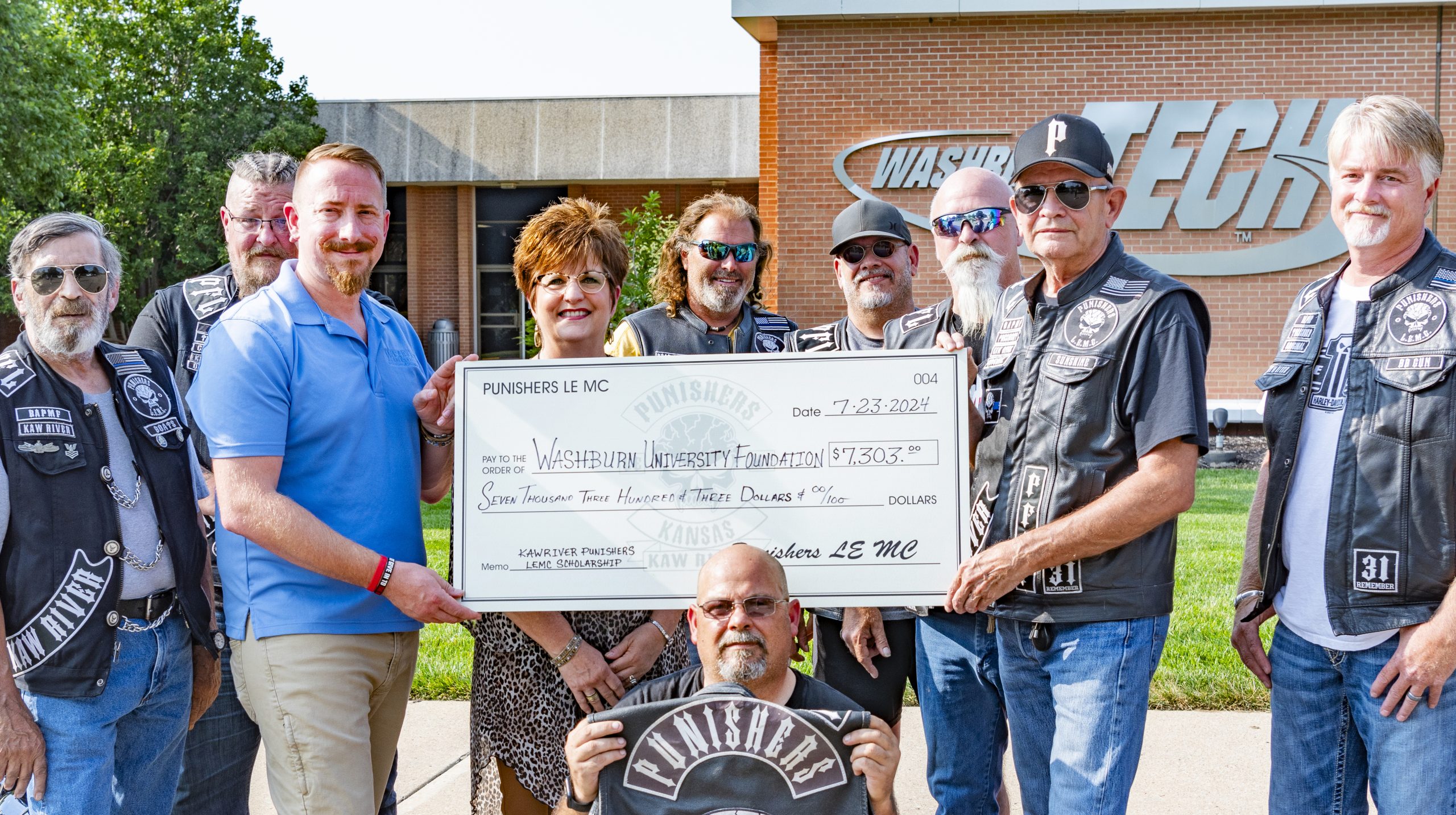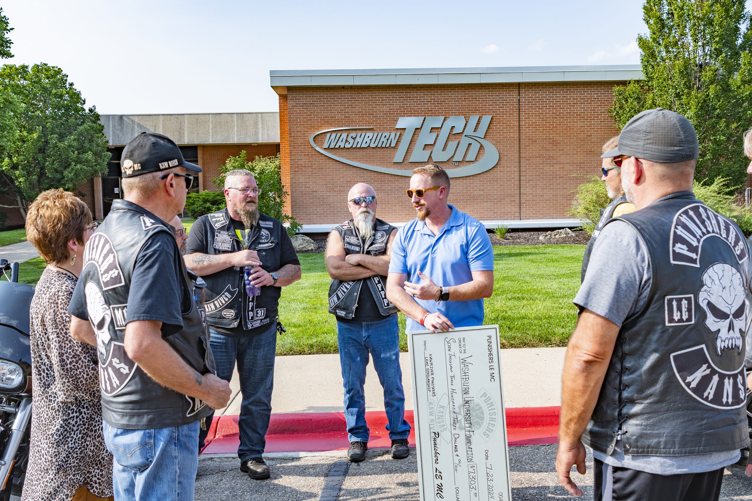 They are the Kaw River Punishers, the local chapter of the Punishers Law Enforcement Motorcycle Club, a brotherhood of bikes comprised of current or former law enforcement officers, firefighters, military personnel, EMTs, first responders and likeminded individuals. They were there to present Washburn Tech with a $7,300 check for the scholarship fund they created, to support dependents of first responders pursuing technical education at Washburn.