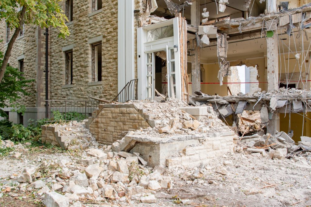 Benton Hall’s iconic double staircase and front door during demolition this summer.