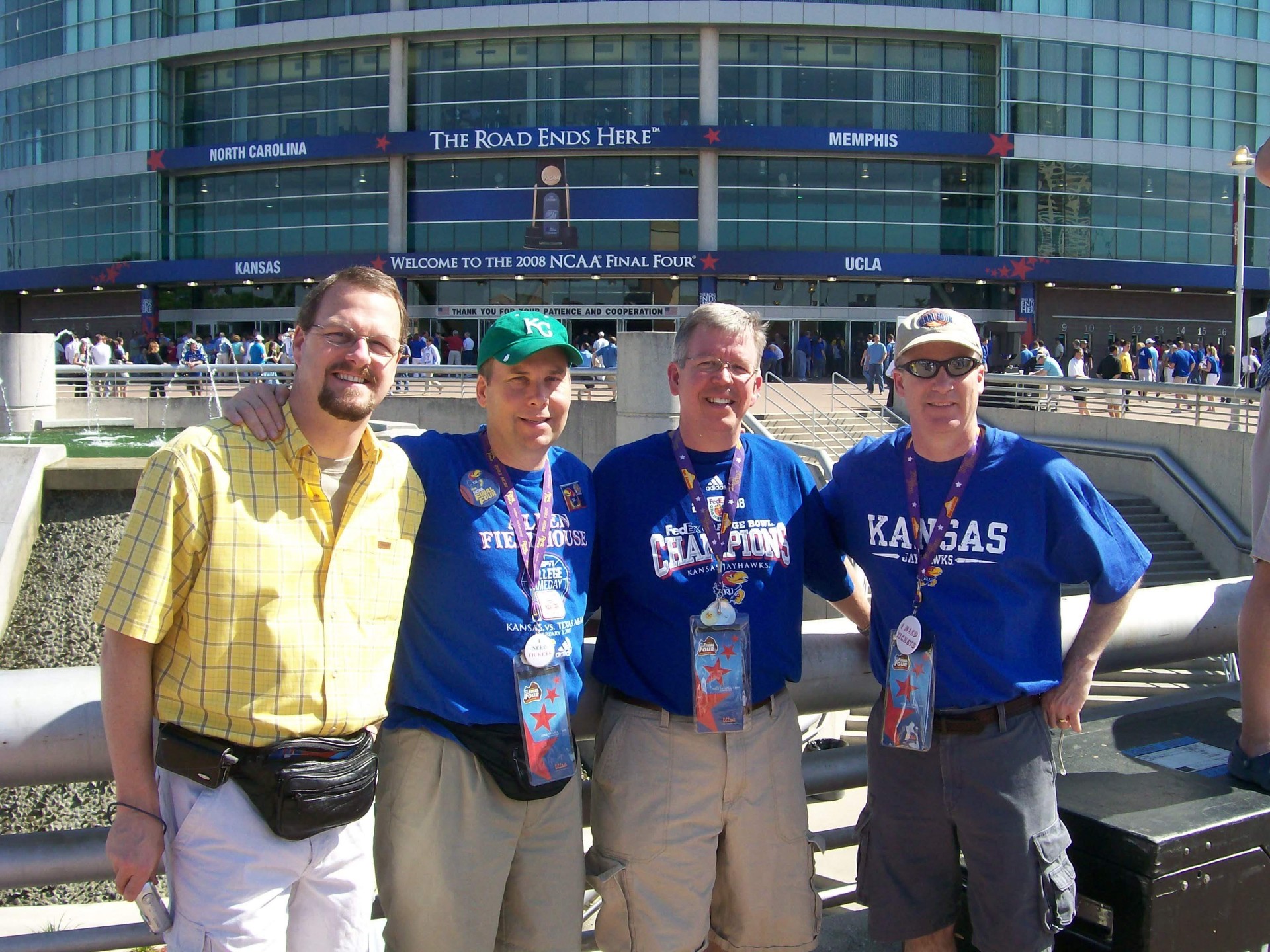 (From left to right) Matt Hesse, Christopher Korth, Bren Abbott, and Calvin Rider pose outside the 2008 Final Four in San Antonio, Texas. The University of Kansas won the national championship that year.