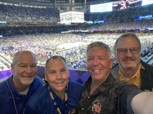 Because the Final Four moves around, the crew has seen many different parts of the country. When the games are in New Orleans, they’ve gone alligator hunting. In Indianapolis, they’ve visited the infamous speedway. In Houston, they’ve been to NASA and an Astros opening day game. No matter the location, steakhouse reservations are a must.